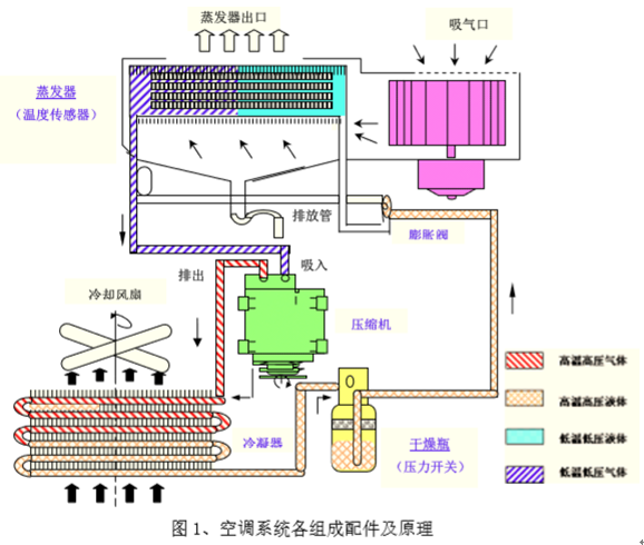 從廣義上理解,裝載機空調具有制冷、制熱、通風、除塵等功能,通常講的裝載機空調是單指其制冷功能。目前,裝載機空調系統主要采用蒸汽壓縮式制冷,主要由壓縮機、冷凝器、儲液干燥器、膨脹閥和蒸發器等部件組成,并通過管路及其他輔助附件連接起來形成一個封閉的循環系統。